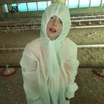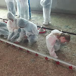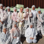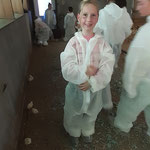 Auf dem Hof durften wir den Hähnchenstall besichtigen. Bevor wir hineingingen, zogen wir Schutzanzüge an - das war ganz schön spannend und lustig!