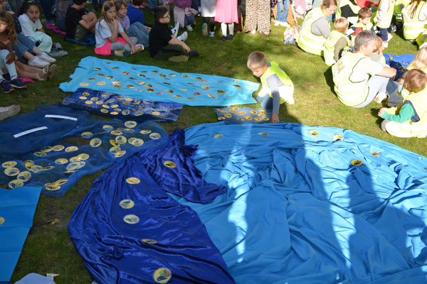 Unter dem Motto „Kinder haben Rechte!... auf Inklusion und Teilhabe“, fand in diesem Jahr der Weltkindertag am 19.09.2025 bei strahlendem Sonnenschein auf der Kirchwiese an der Ev.-reformierten Kirche in Gildehaus statt. Die Kinder aus den Kindertagesstätten „Regenbogen“, „Sonnenschein“, Pusteblume“ sowie „Löwenzahn“ sowie die Jahrgänge 1 und 2 der Grund- und Hauptschule Gildehaus feierten an diesem Vormittag gemeinsam mit Pastorin Carolin Zierath einen Gottesdienst. Dabei kam der Mutkröte und dem Frechvogel mit Hilfe eines kleinen Rollenspiels eine wichtige Rolle zu, um den Kindern zu zeigen: „Ich bin anders als du und das ist gut so!“ Um diesen Gedanken zu unterstützen, lag in der Mitte der Wiese ein großes blaues Tuch. Darauf hatten alle Einrichtungen jeweils ein weiteres blaues Tuch gelegt und dies mit kleinen Stickern von der Mutkröte und dem Frechvogel versehen. Auch hier fand sich auf der Rückseite der Spruch: „Ich bin anders als du und das ist gut so!“