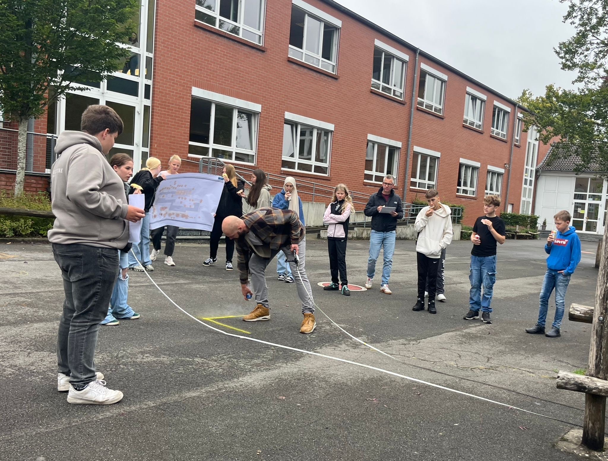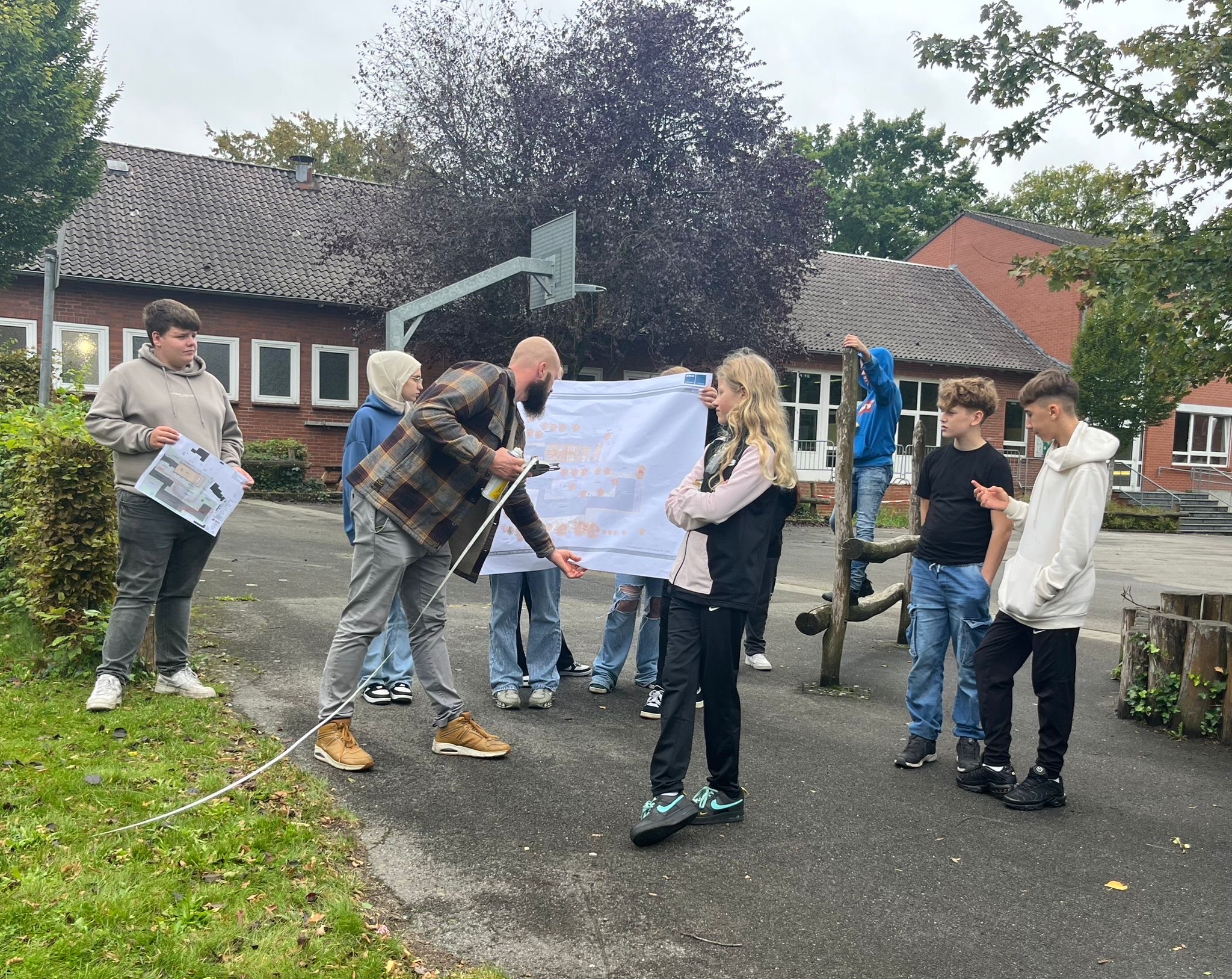 Unter der Berücksichtigung der Feuerwehrumfahrung zeichneten die Jugendlichen ihre Wünsche in einen Plan ein. Tom Amshoff zeigte den Schülerinnen und Schülern auf, welche Wünsche aus seiner Sicht realistisch sind und bei welchen es aktuell Hürden geben könnte. Die Umrisse des möglichen Fußballfeldes und auch des gewünschten Offenbodenbereichs sprayte Herr Amshoff gemeinsam mit den Schülern auf den Schulhof. So konnten sich alle ein besseres Bild von der tatsächlichen Größe machen. Zudem wurden Vorschläge für die Standorte neue Bänke besprochen.