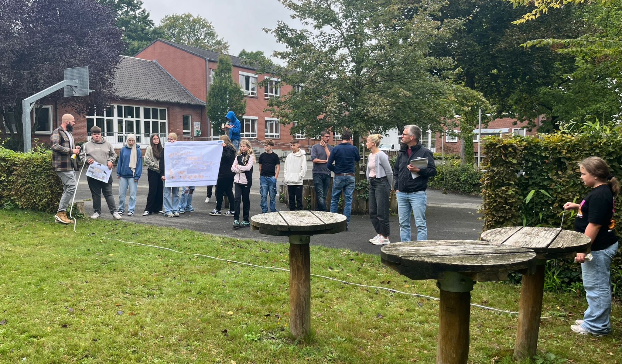 In einem Gespräch mit dem Bürgermeister Herrn Dr. Volker Pannen und Herrn Tom Amshoff vom Bauamt der Stadt, der die aktuellen Pläne vorstellte, äußerte die Schülervertretung ihre Bedenken und auch den Wunsch zur aktiveren Beteiligung der SV an der künftigen Gestaltung des Schulhofes. Diesbezüglich stellten die Schülerinnen und Schüler, die von Dennis Kley (Jugendpfleger bei der Stadt Bad Bentheim) und den SV-Lehrern Dörthe Kruse und Dries Middendorf unterstützt wurden, einige Aspekte dar, die für sie einen ansprechenden und bewegungsfreundlichen Schulhof ausmachen. Zudem machten sie erste konkrete Vorschläge zur Umsetzung.